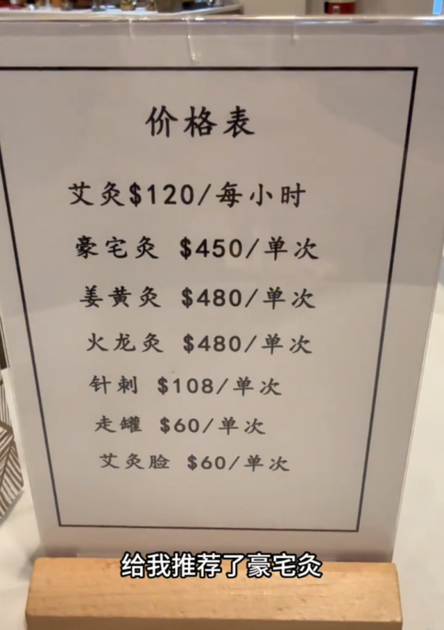 而其他的项目也都透露出小奢,普通拔罐60美元一次,基础艾灸每小时120美元,而“豪宅灸”直接翻了几倍。