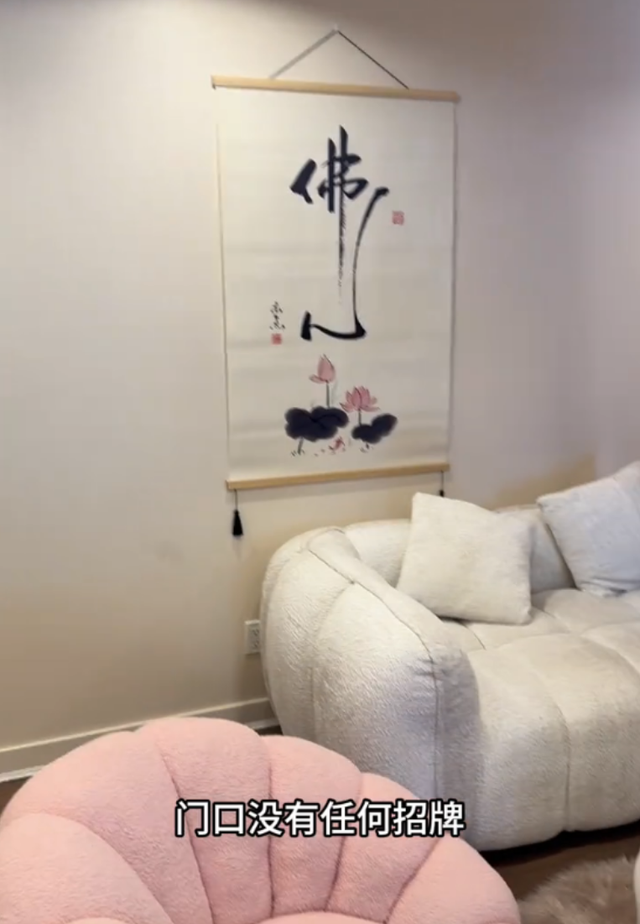 室内空间不大,装修风格是清净佛系路线。原木地板,米白色沙发,墙上挂着“佛”字书法,角落里还摆着香薰和绿植。整体温馨,简洁,像是住家客厅。