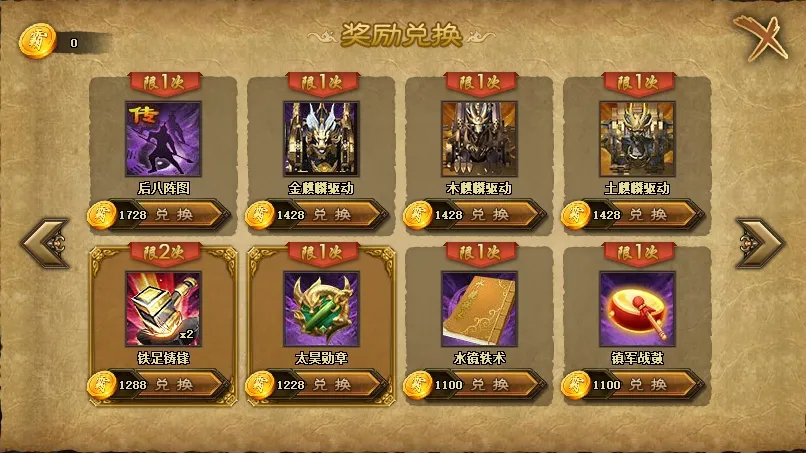④:【绿色兵符】:这里虽然当前页游可以兑换绿符,还是比较推荐玩家通过活动去获取,因为国家赏令更适合换其他更有用的道具,三国争霸活动可以花费70金币获取1套陷阵藤甲兵符,700金币获取2套陷阵藤甲兵符,其他的绿符不推荐玩家获取,因为属性收益还是较低。