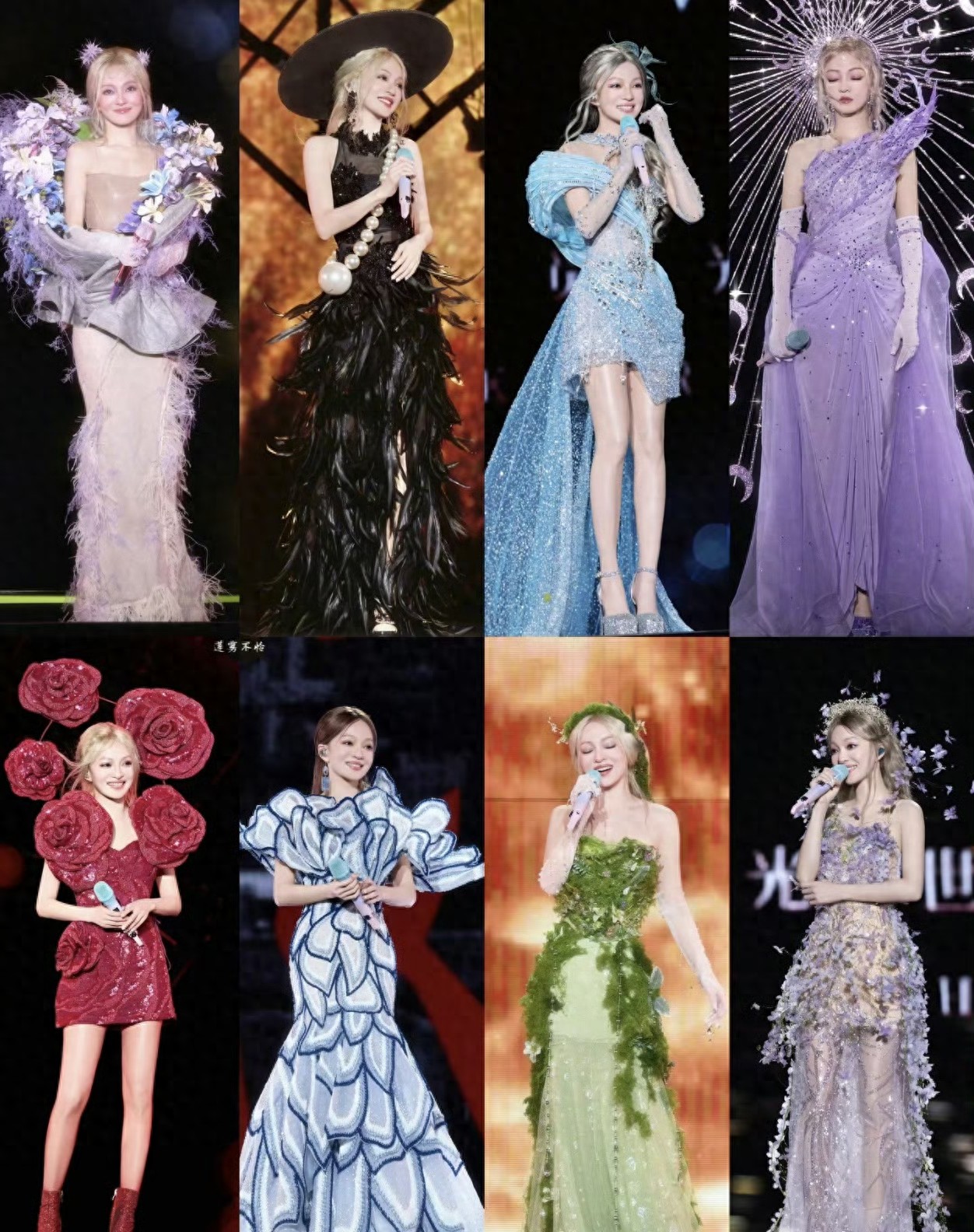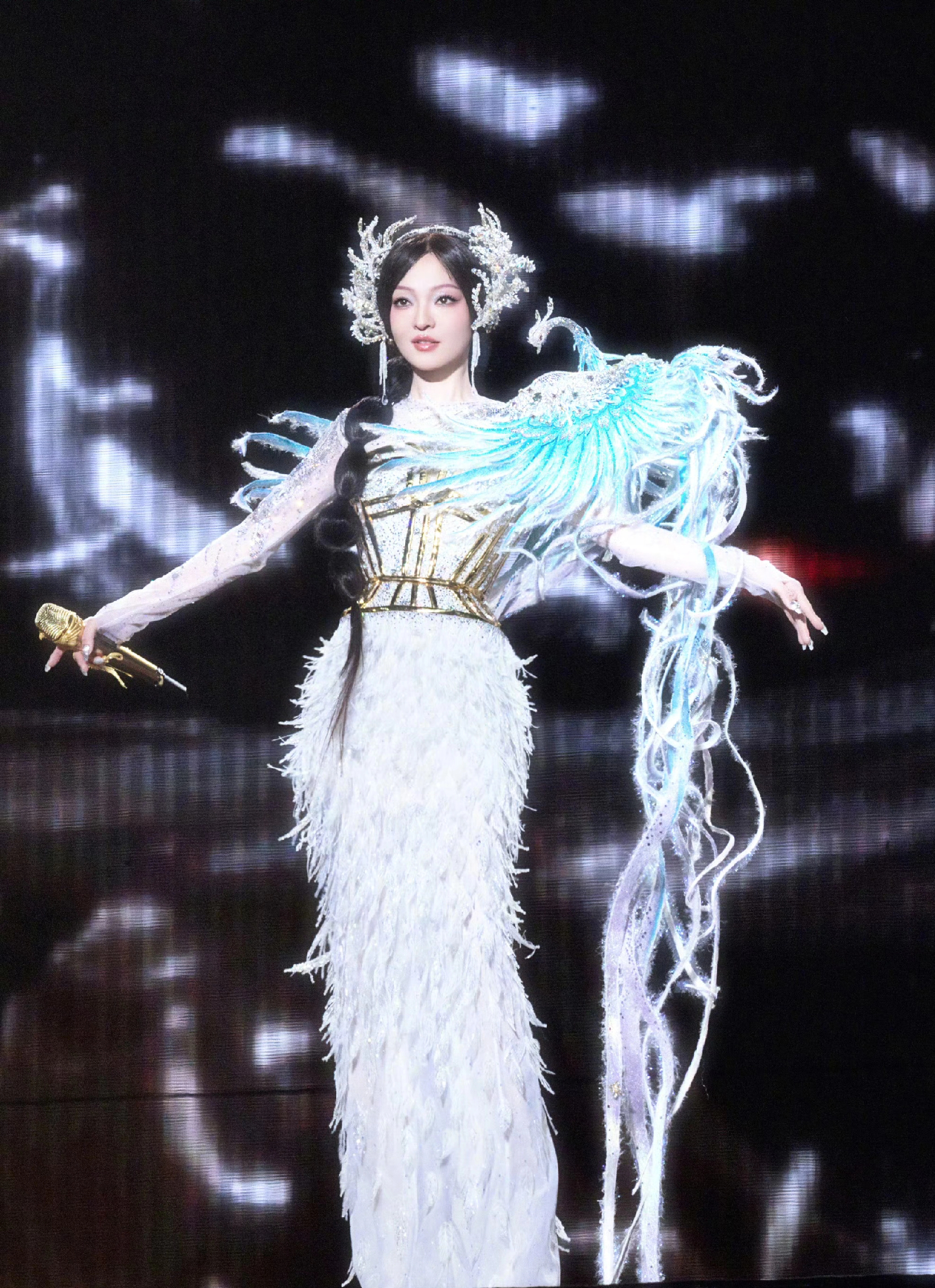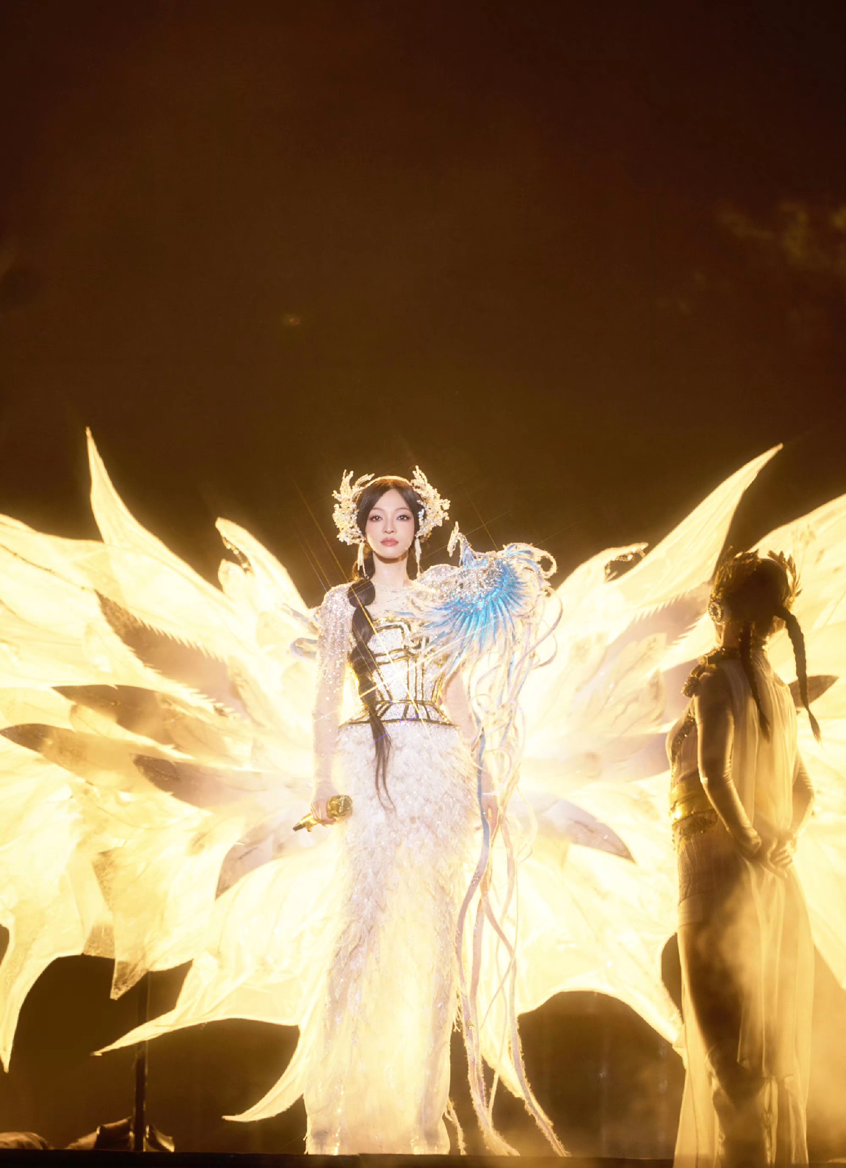 神级造型频出:耗时36600小时缝制的“火凤凰”礼服,镶嵌60万颗施华洛世奇水晶,被《VOGUE》盛赞“重新定义演出视觉”;“重明神女”采用光纤布材质,光影流动间宛如精灵下凡;机械羽翼战袍通过LED技术实现人衣互动,让娇小的她穿出超模气场;