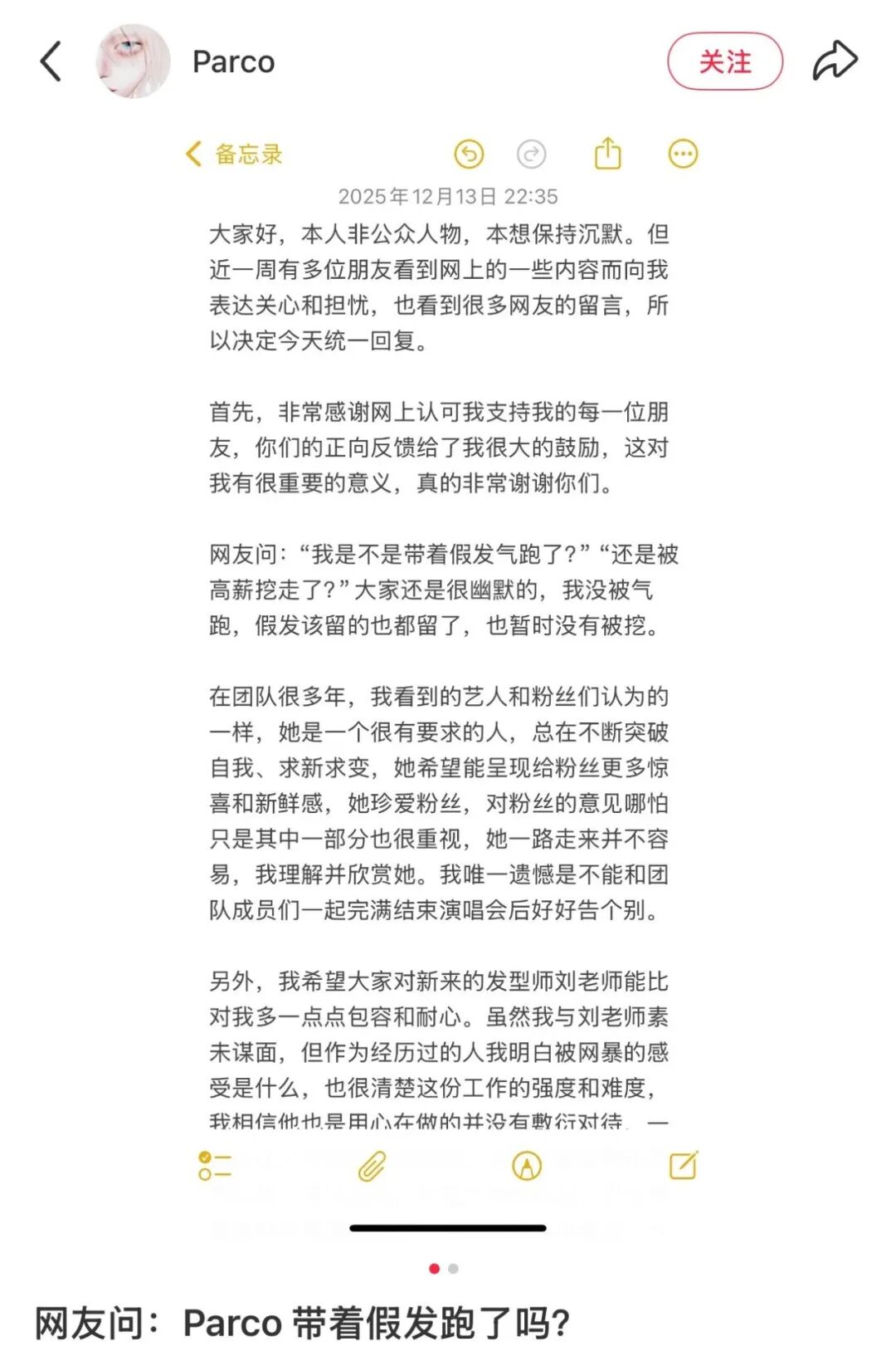 “这才是体面人该有的样子!”12月17日,深陷“裁员裁到大动脉”舆论漩涡的张韶涵前造型师帕克(Parco),终于正面回应争议,3句话澄清离职真相,既打破“被网暴逼走”“高薪挖角”的传闻,还主动为新团队发声,瞬间圈粉无数。这场横跨半个月的造型风波,从“精灵变阿姨”的吐槽狂欢,变成了对“幕后功臣”的集体致敬,网友直呼“格局差距太大了”!