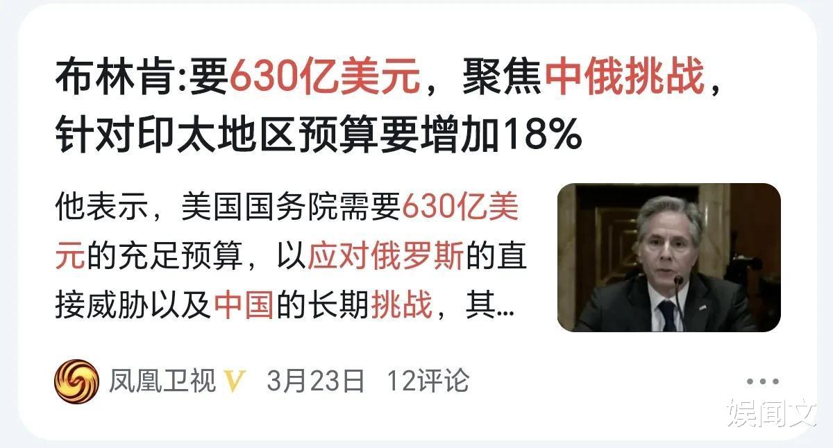 3月22日,美国国务卿布林肯公开表示,要拿出630亿美元专门应对中国和俄罗斯的“挑战”,他还说,针对印太地区的预算将增加18%。