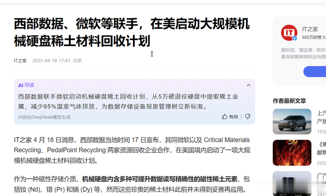 西部数据、微软等联手,在美启动大规模机械硬盘稀土材料回收计划