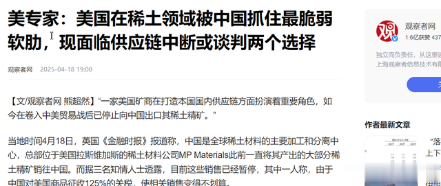 美专家:美国在稀土领域被中国抓住最脆弱软肋,现面临供应链中断或谈判两个选择
