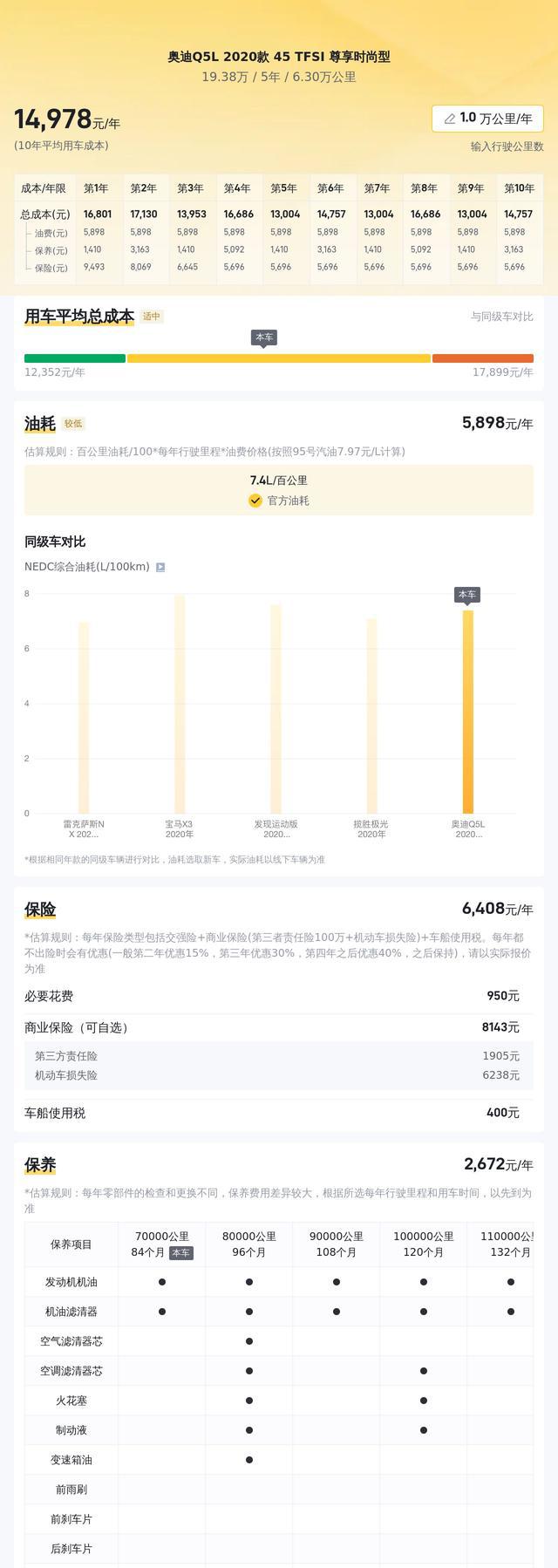 谈到用车成本,很多人总是心有戚戚。二手车的用车成本通常包括燃油费、保险费、保养费用等。如果我们假设年均行驶里程为2万公里,根据行业平均数据来估算,二手奥迪Q5L的年综合用车成本可能在14103元至17620元之间。这听起来似乎并不算太高,但考虑到不同驾驶习惯及保养需求,最终的支出可能会有较大差异。