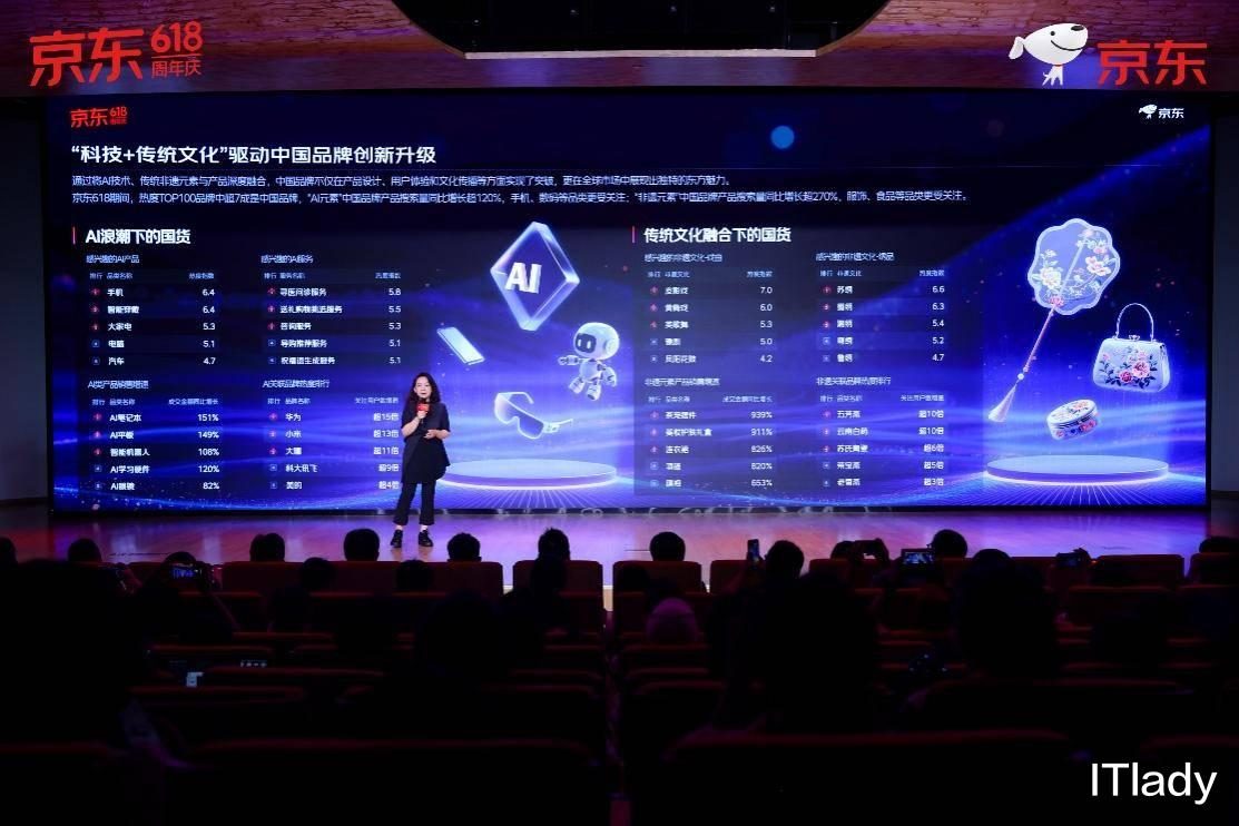 今年京东618消费趋势又有新变化,呈现四个显著特点。首先,AI浪潮催动AI相关产品受到高度关注,同时国潮商品受到消费者更多青睐。在“科技+传统文化”的双重驱动下,京东618期间热度TOP100品牌中有超七成是中国品牌,“AI元素”、“非遗元素”产品搜索量同比分别增长超120%、270%。