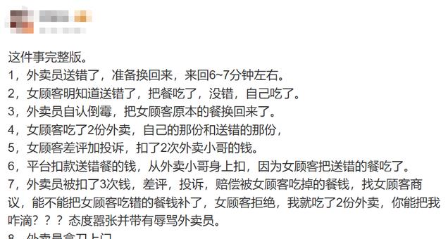 后来有网友总结了一个完整版,原来极端的不光是外卖小哥,更极端的是爆料的女顾客。