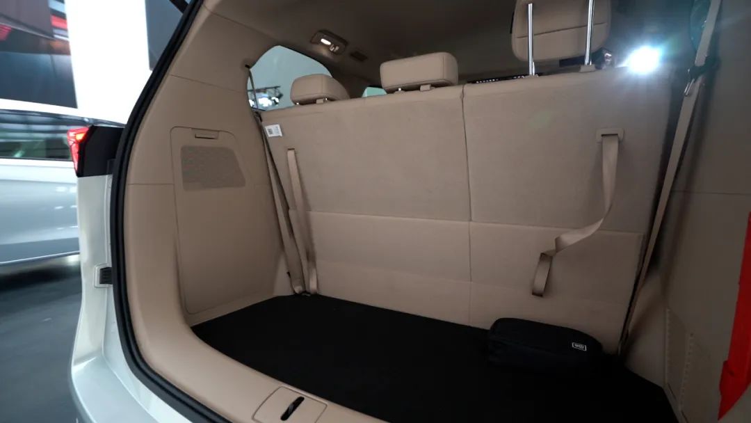 再有就是三排坐垫比某些车二排还宽裕,尤其是座椅靠背足够高。后备箱更是宽大,横着摞四个行李箱,还能给媳妇留出放菜篮子的缝儿。