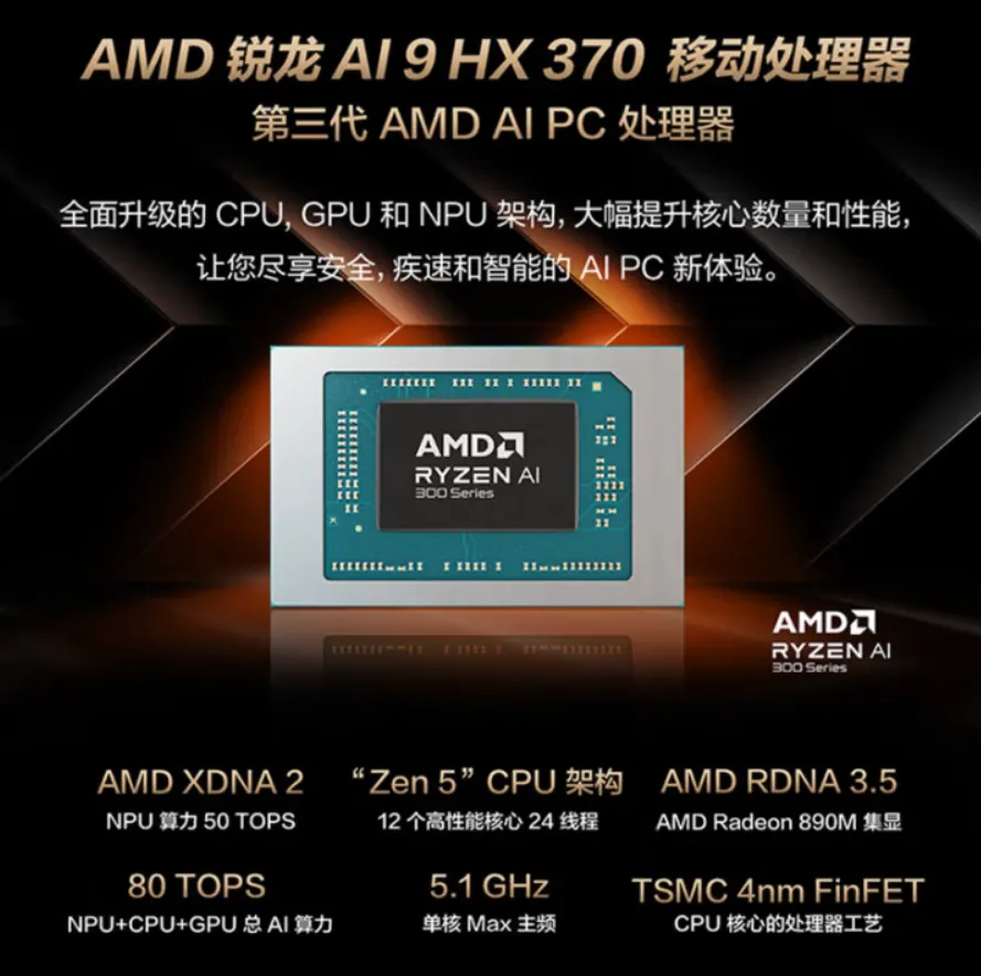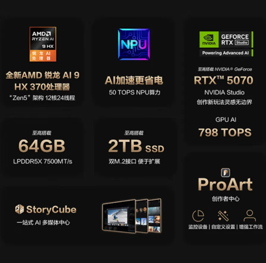 2025款ProArt创16的处理器没变,依旧是AMD第三代AIPC处理器锐龙AI 9 HX370,采用4个Zen5和8个Zen 5c共计12核心24线程,最高加速频率5.1GHz,内置36MB高速缓存,集成16个CU单元的Radeon 890M核显,NPU算力50TOPS,CPU+GPU+NPU的整体AI算力高达80TOPS。