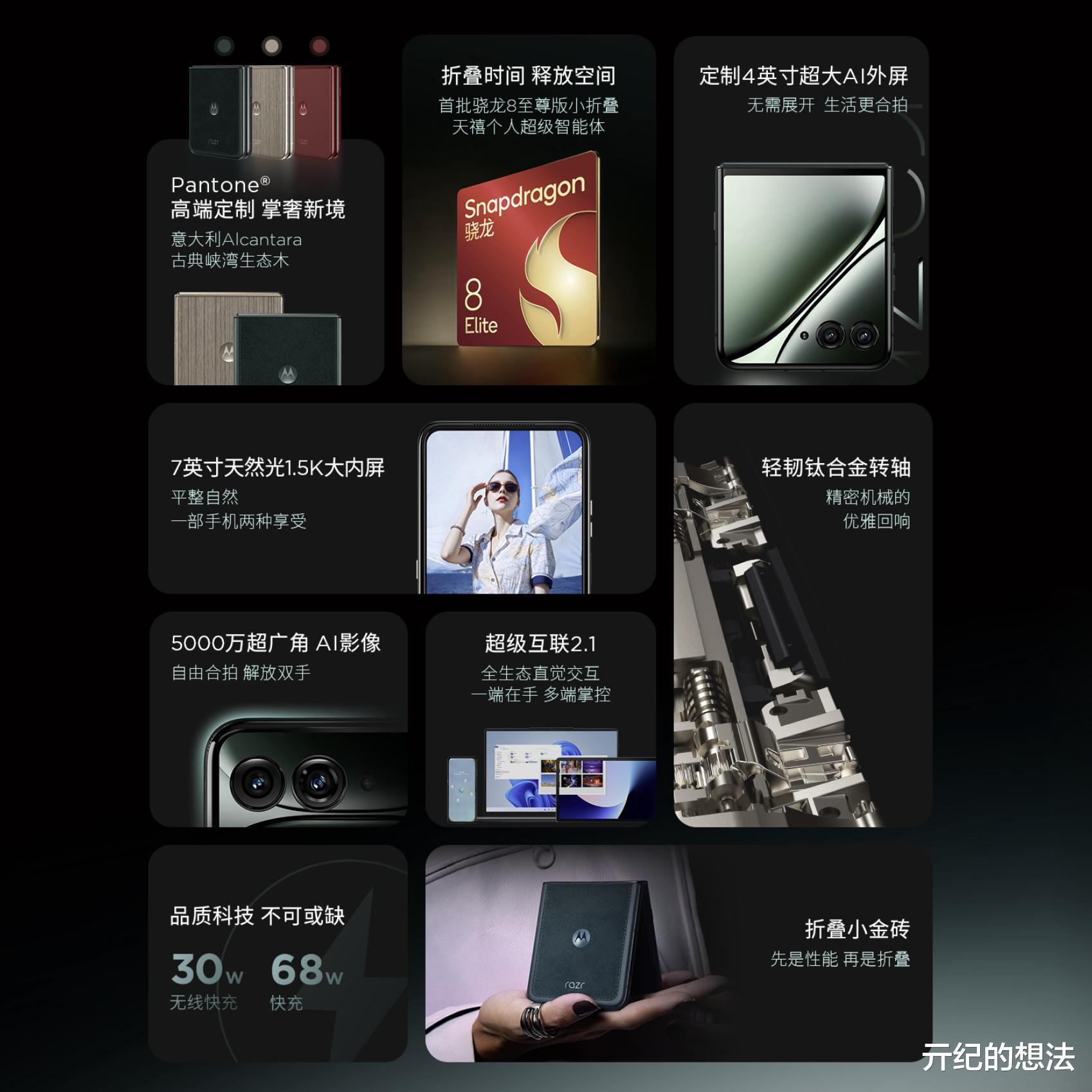 moto razr 60 Ultra搭载骁龙8至尊版,内置4700毫安时电池,支持68W有线充电和15W无线充电,机身仅为7.29毫米和199克。该机采用7英寸1.5K超大内屏,还有独家定制的4英寸外屏,两款屏幕均支持1-165Hz LTPO自适应刷新率和电影级色彩,还通过了SGS低蓝光低脱颖双重护眼认证。屏幕盖板升级为康宁大猩猩玻璃陶瓷,搭配轻韧钛合金转轴和IP48防尘防水,进一步提升了整机的耐用性。