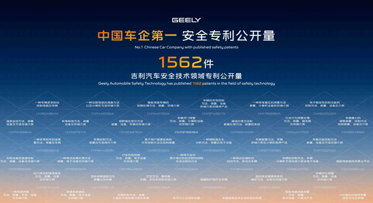 不仅如此,吉利近11年累计2500亿研发投入(位列中国民企研发前十)、1562件安全专利(居中国车企第一),还参与多项国家汽车安全法规制定,正以实际行动推动“安全平权”,让高品质安全守护惠及更多用户。