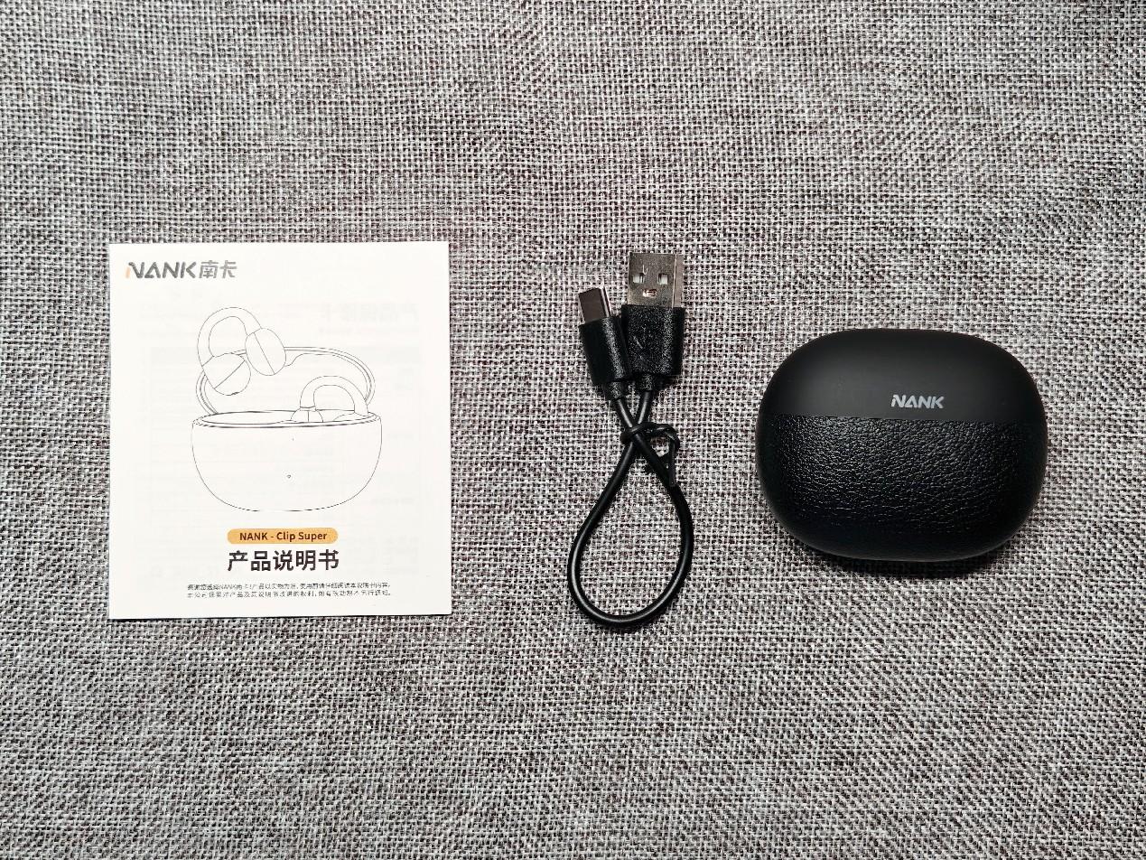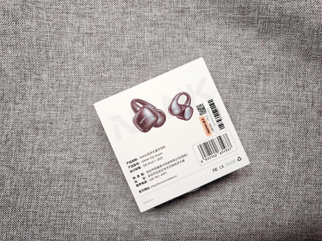 开箱外观南卡Clip Super耳夹式蓝牙耳机的包装盒采用了简约的设计风格,盒体以白色为主色调,正面印有产品的外观图,左上角是南卡的品牌logo。
