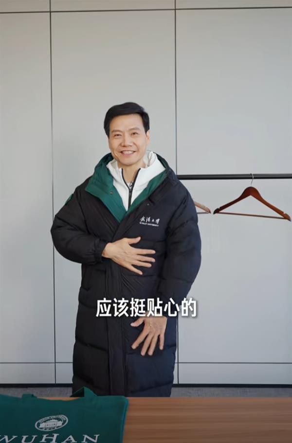雷军还发布了自己穿上雷军班同款班服,套上武大最新款羽绒服的视频。