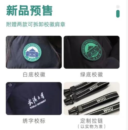 据了解,羽绒服采用防风面料、优质白鸭绒,正面还有“武汉大学”绣字校标,并且附赠两枚可拆卸校徽肩章。