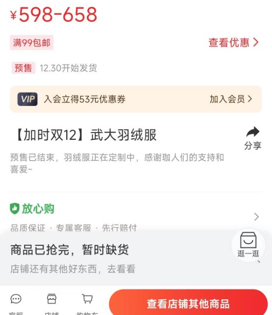 中长款预售价598元,长款预售价658元,预售截至12月12日20:00,限量发行,预计12月30日起按顺序发货。