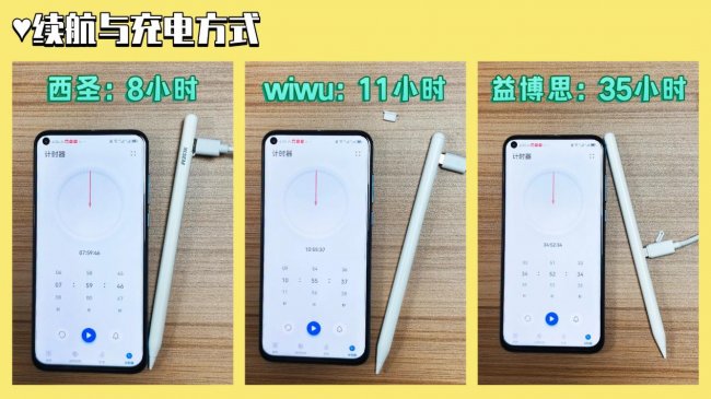 续航和充电方式直接决定了我们连续使用的体验。为更贴近实际操作,下面我就在统一充满电的前提下,使用同一计时器对西圣、wiwu 和益博思三款电容笔进行持续书写测试,记录各自的续航时长。同时对比它们的充电方式便利性与兼容性,观察在日常使用场景下哪款更省心、灵活。