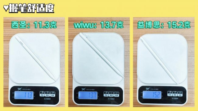 握笔舒适度直接决定长时间书写和绘画时的手感体验,其影响因素包括笔身重量、材质以及笔杆粗细。为贴近实际使用,下面我就对西圣、wiwu 和益博思三款电容笔进行了连续握持测试,同时用电子秤测量笔身重量,以观察各款笔在长时间使用下的舒适度差异。