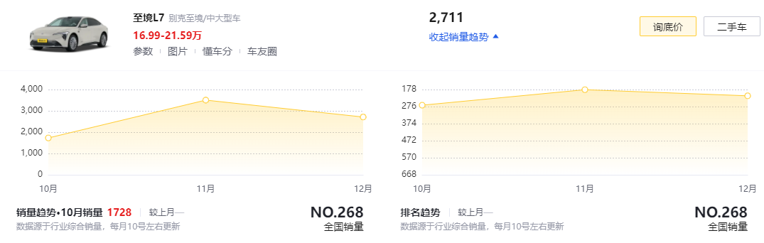 从销量成绩上来看的话,虽然别克至境L7在12月份只交付了2711台新车,但从增程动力的轿车市场来看,其实至境L7也是一款排名比较靠前的产品。而且从整车的设计,以及对应的价格和功能配置来看,至境L7的表现也并不差,同时中高配车型还配备了激光雷达和Momenta辅助驾驶系统。当然,或许是因为这个细分市场的用户群体更偏向于家庭出行的场景,大家更想要一台离地间隙高且尺寸够大的SUV车型。
