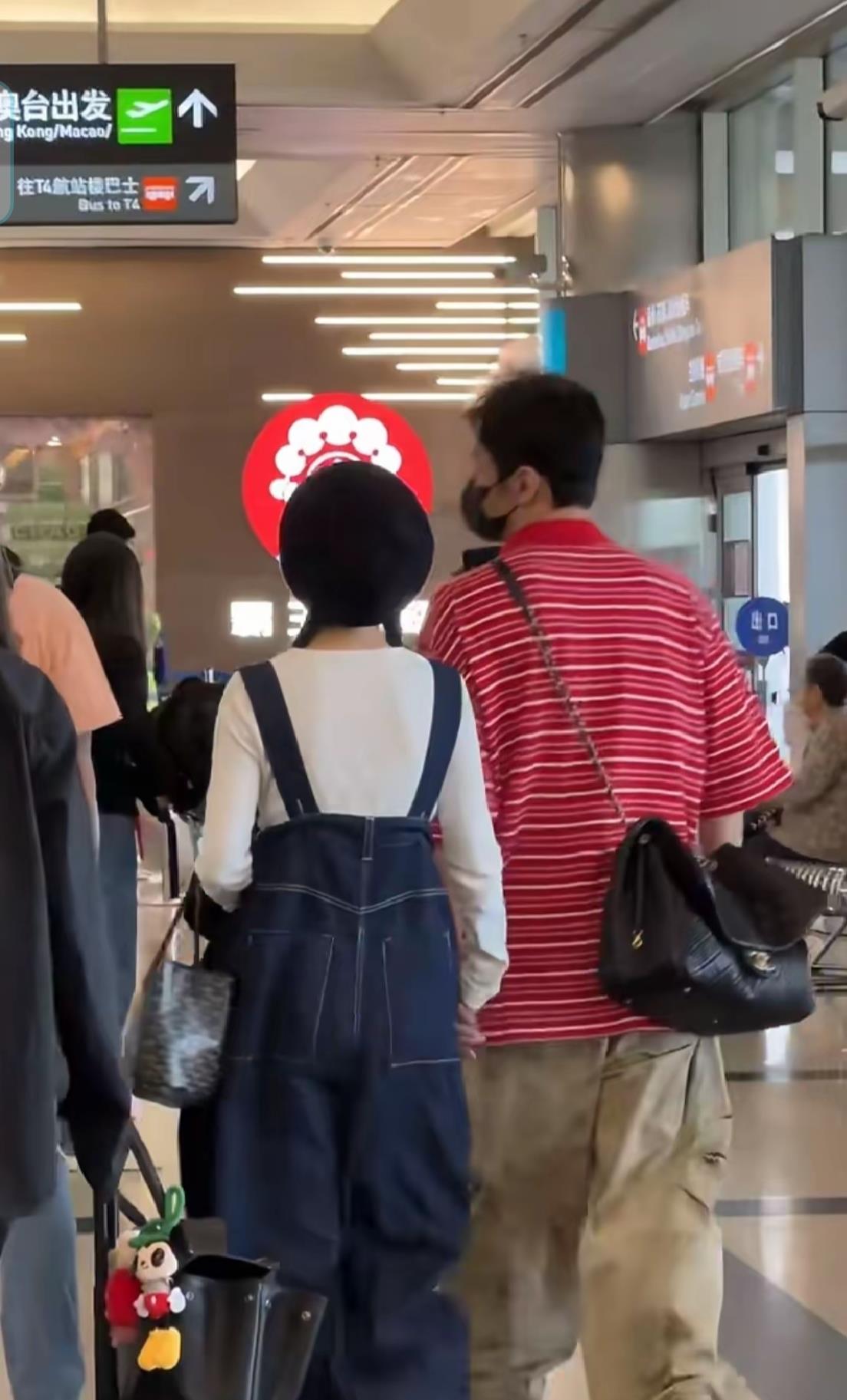 李荣浩倒是把"酷"进行到底,工装裤口袋里塞着鼓鼓的登机牌,右手无名指戒指在机场顶灯下反着光。 他背上那个明显小一号的链条包,随着走路节奏一下下轻拍着后背。 有眼尖的粉丝发现,杨丞琳的手机壳上印着只眯眼笑的柴犬,跟李荣浩手机壳上的胖橘猫正好凑成"猫狗双全"组合。