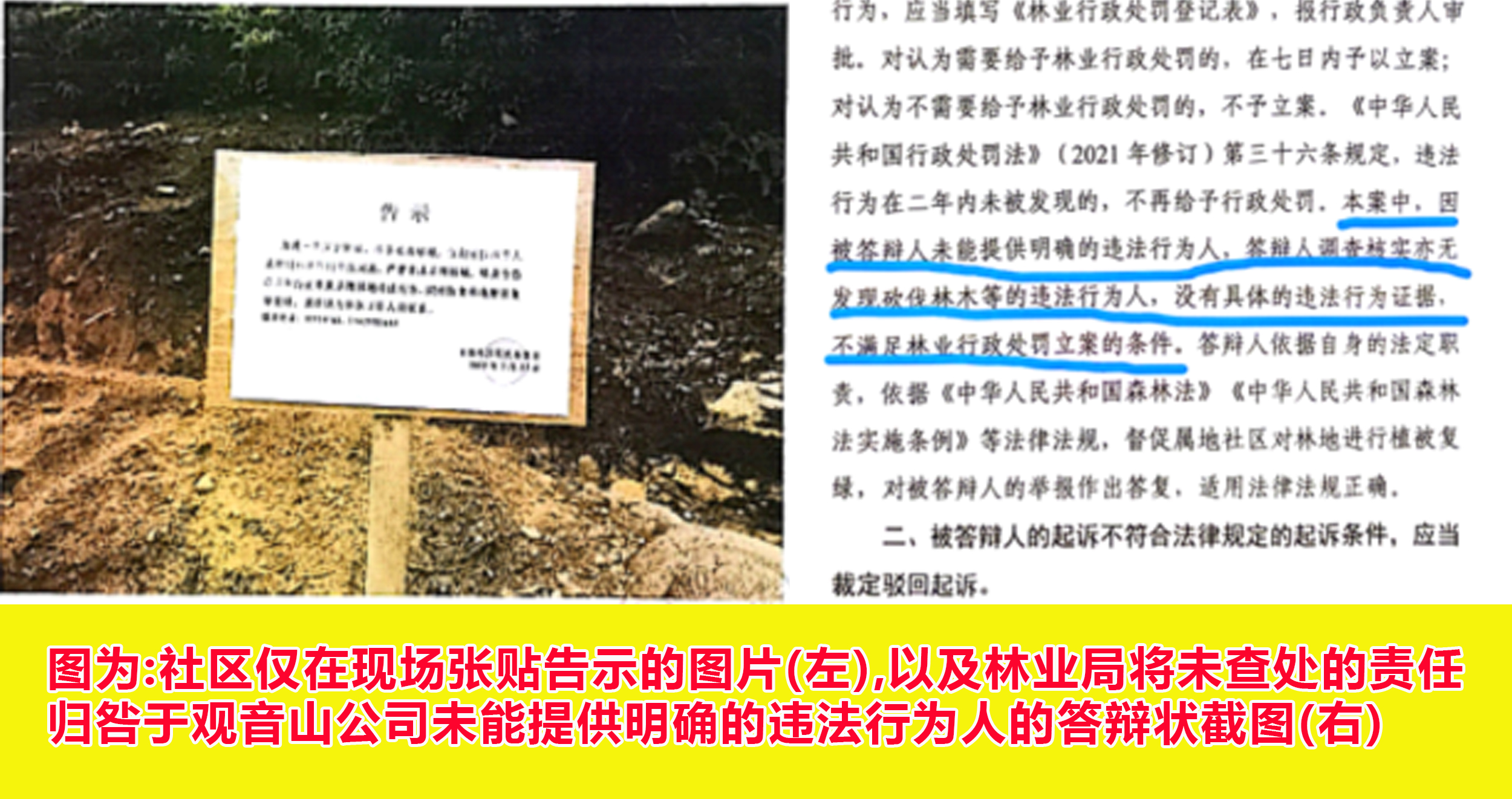 另有多起毁林开荒案件,如两处合计约500平方米林地被开垦为菜地,林业局先是谎称“未发现砍伐”,后又将查找违法者责任推给社区,甚至反指观音山公司“未能提供明确行为人”,完全无视其法定监管职责。