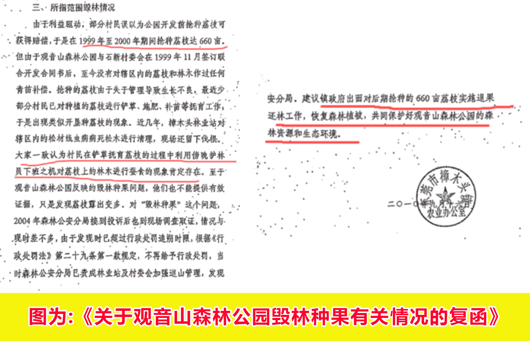 一、660亩原始次生林被毁,监管机构以“超追诉期”搪塞最令人痛心的是仙泉水库周边660亩原始次生林被毁事件。早在1999年至2000年,部分村民误信抢种荔枝可获赔偿,在林下大规模种植果树。2004年,观音山公司首次举报,东莞市林业局以“超过行政处罚追诉期限”为由不予处理。
