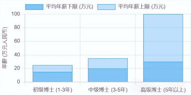 据调查,我国博士的平均年薪大约在20万~30万元人民币之间,其中刚毕业的初级博士年薪约15万~25万元,而拥有5年以上经验的高级博士年薪可达30万元以上,顶尖人才甚至能达到50万~100万元。下图展示了不同工作经验年限的博士群体的平均年薪范围: