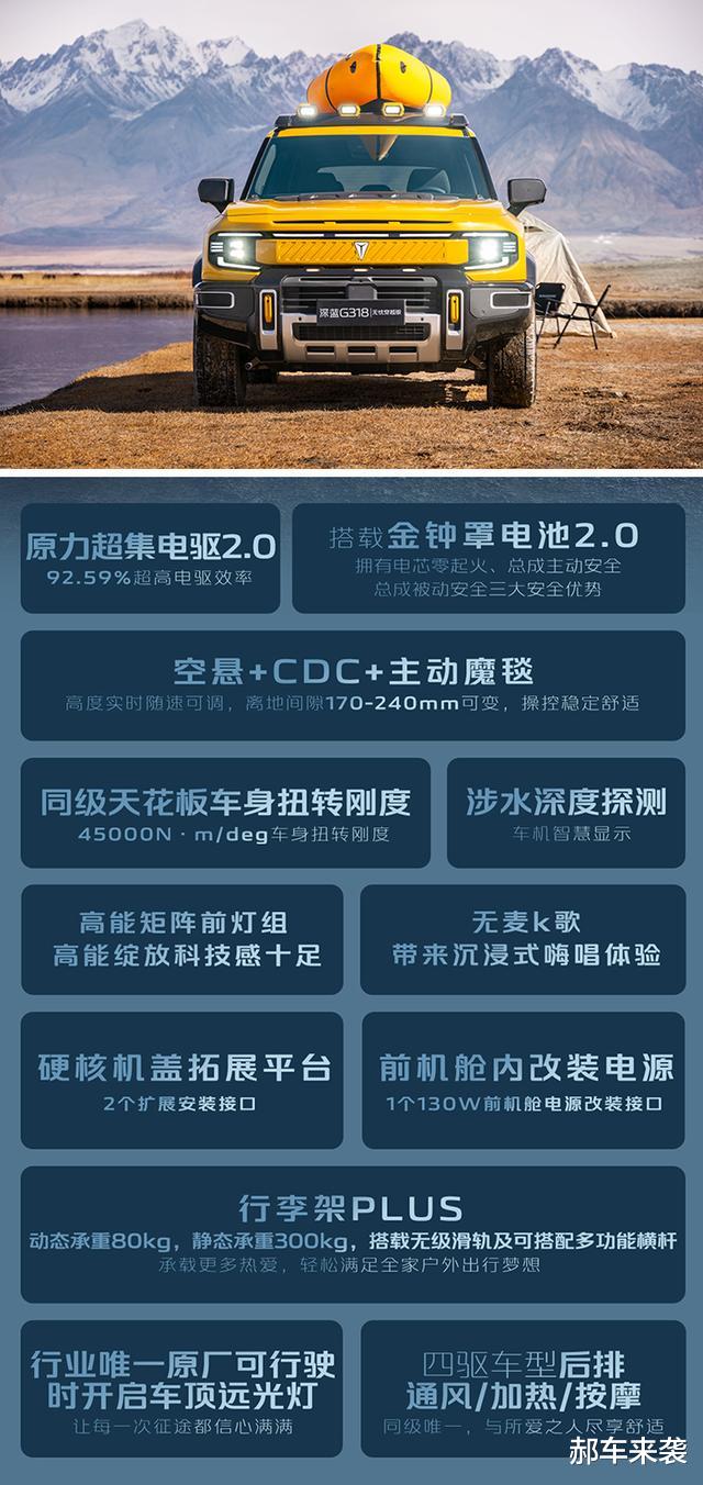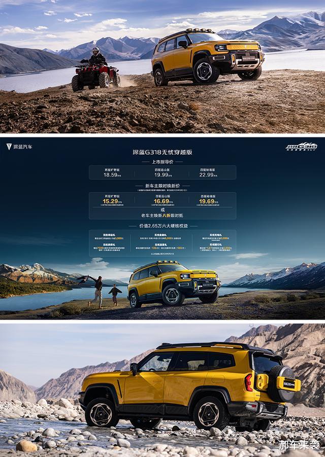 《郝车来袭》原创新车:4月18日,深蓝G318无忧穿越版正式上市,新车共推出三款车型,售价区间为18.59万~22.99万元,值得一提的是,官方还发布限时(5月3日前)福利价区间为15.29万~19.69万元。从无忧穿越版车名不难发现,新车将比普通G318增加更多专业越野套件,不仅能进一步优化实用性,而且颜值也拥有大幅提升,那么新车都有哪些亮点呢?