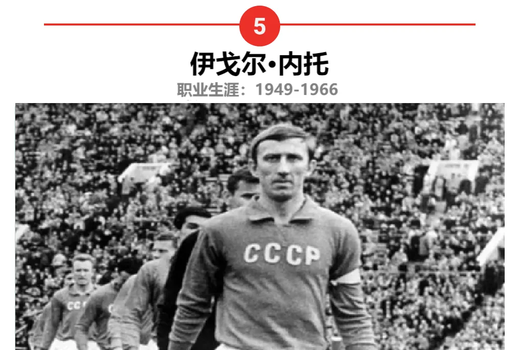 伊戈尔·内托以卓越的领导能力、精准的传球、全面的技术以及出色的战术素养著称,是苏联队1950-60年代的核心人物。作为苏联国家队的队长,内托率领球队夺得1956年墨尔本奥运会金牌和1960年首届欧洲杯冠军,奠定了苏联足球在国际足坛的地位。他职业生涯的全部时间都效力于莫斯科斯巴达克,帮助球队5次问鼎苏联联赛冠军。