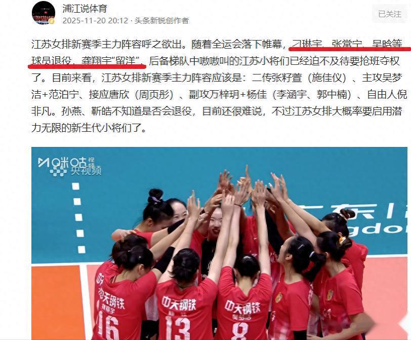 龚翔宇赴美国女排联赛打球,主力二传刁琳宇和主力主攻张常宁退役,江苏女排整体实力下降了不止一个档次。