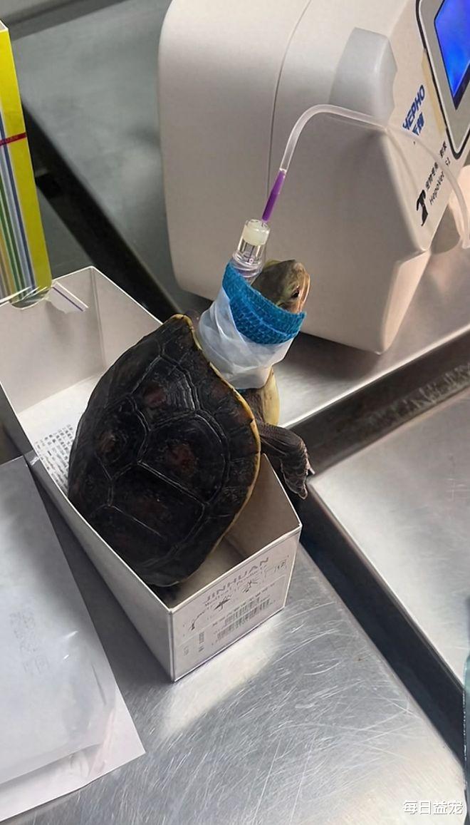 于是,小乌龟“站”上了动物医院的输液台,脖子被医生缠满胶布,扎着点滴针,眼神无辜又委屈。