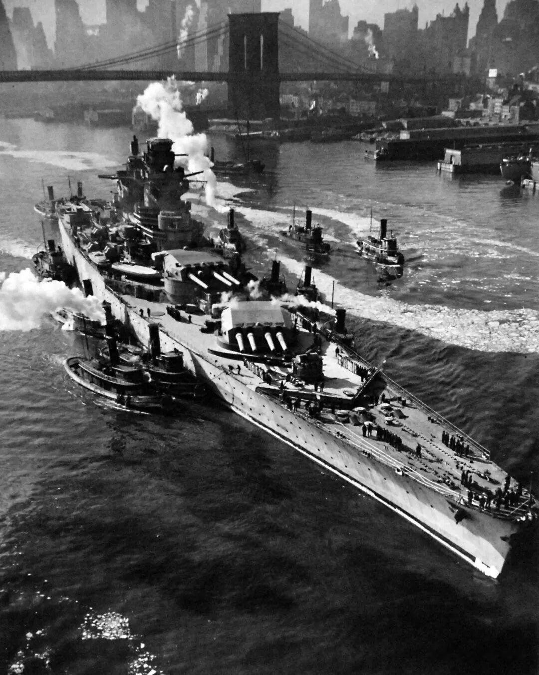上图是"黎塞留"号战列舰抵达纽约进行维修。请注意其火控塔顶部已被拆除,以便能从布鲁克林大桥下通过。当时所有美国战列舰的设计都确保其能轻松通过此桥下,蒙大拿级也不会例外。