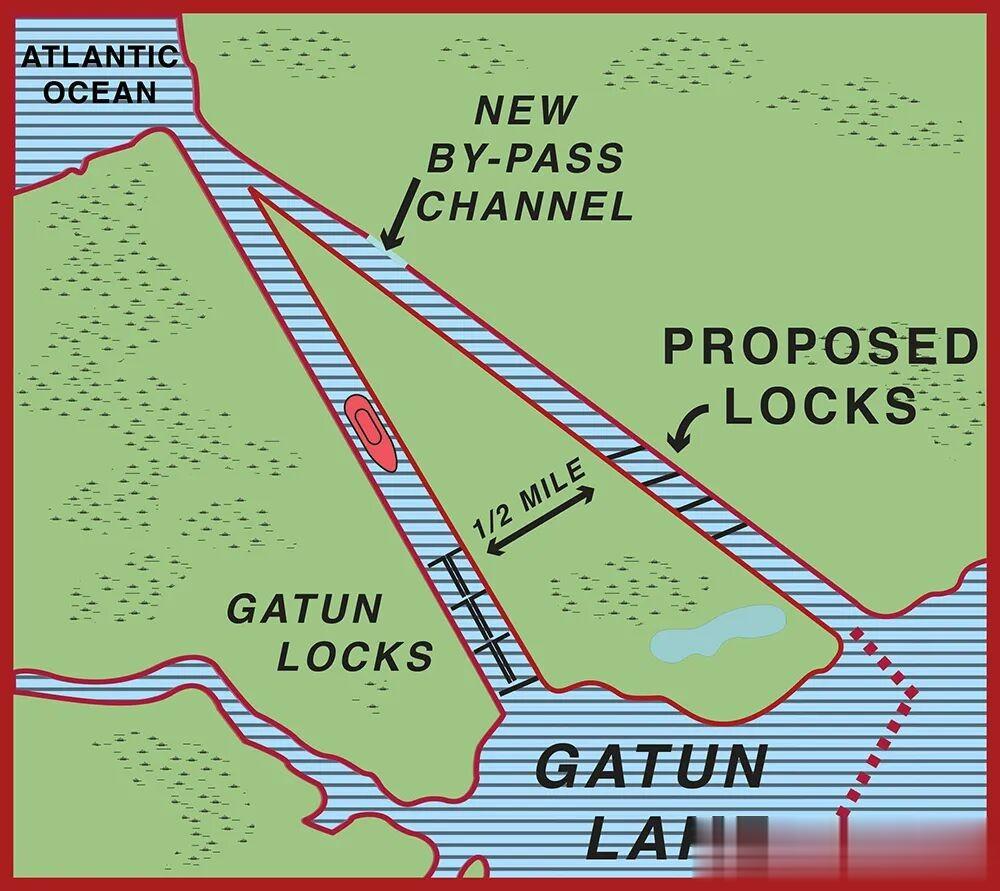 美国国防部改建巴拿马运河的计划示意图,计划在原闸门外新建一道更宽的闸门,以能够使新战列舰通过