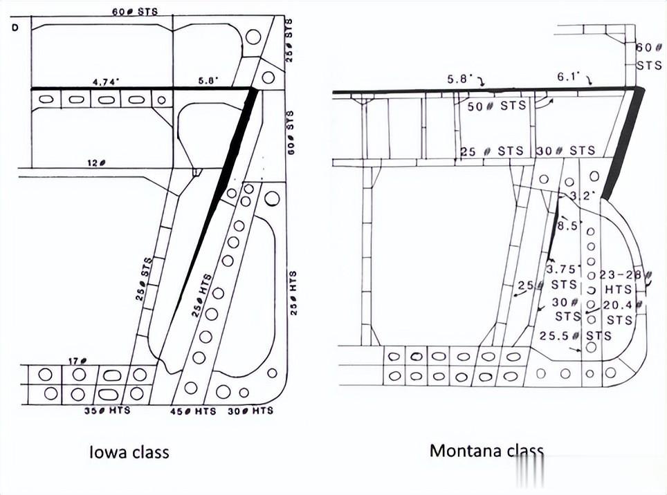 装甲是两级舰之间最大的差异。衣阿华级采用了从前代南达科他级继承而来的内置装甲带。这种设计将装甲带置于船体内部,作为减重措施,帮助该级舰达到了其著名的航速。然而,击中这条装甲带的炮弹需要先穿透外壳。对于击中水线或水线以下的炮弹,这会产生一个不受欢迎的效果,即可能导致船体与装甲带之间的空舱进水。蒙大拿级的设计不受重量限制,因此回归了传统的、装甲位于船体外部的外置装甲带。这确保了潜在的损坏发生在船体外部,并且水密完整性将保持完好。