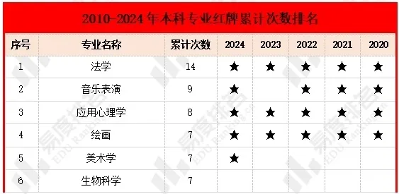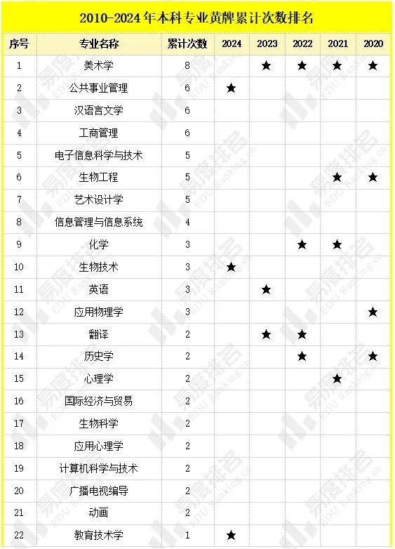 美术学专业累计黄牌次数最多,2013-2018连续6年红牌,2019-2023年连续5年黄牌,今年又变红牌,该专业毕业生的就业情况再次恶化。公共事业管理专业在2010-2014年连续5年黄牌,今年再次上榜。近年得黄牌的专业,短期内就业质量很难有明显的改善,甚至可能更差,在填报志愿时要考虑清楚。