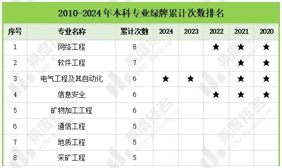 网络工程专业绿牌累计次数达8次,但都集中在2015-2022年,近两年已无缘上榜。近年就业质量较高的是电气工程及其自动化、能源与动力工程、微电子科学与工程等专业,若更为关心毕业后的就业情况,在填报志愿时可优先考虑这些近年得绿牌的专业。