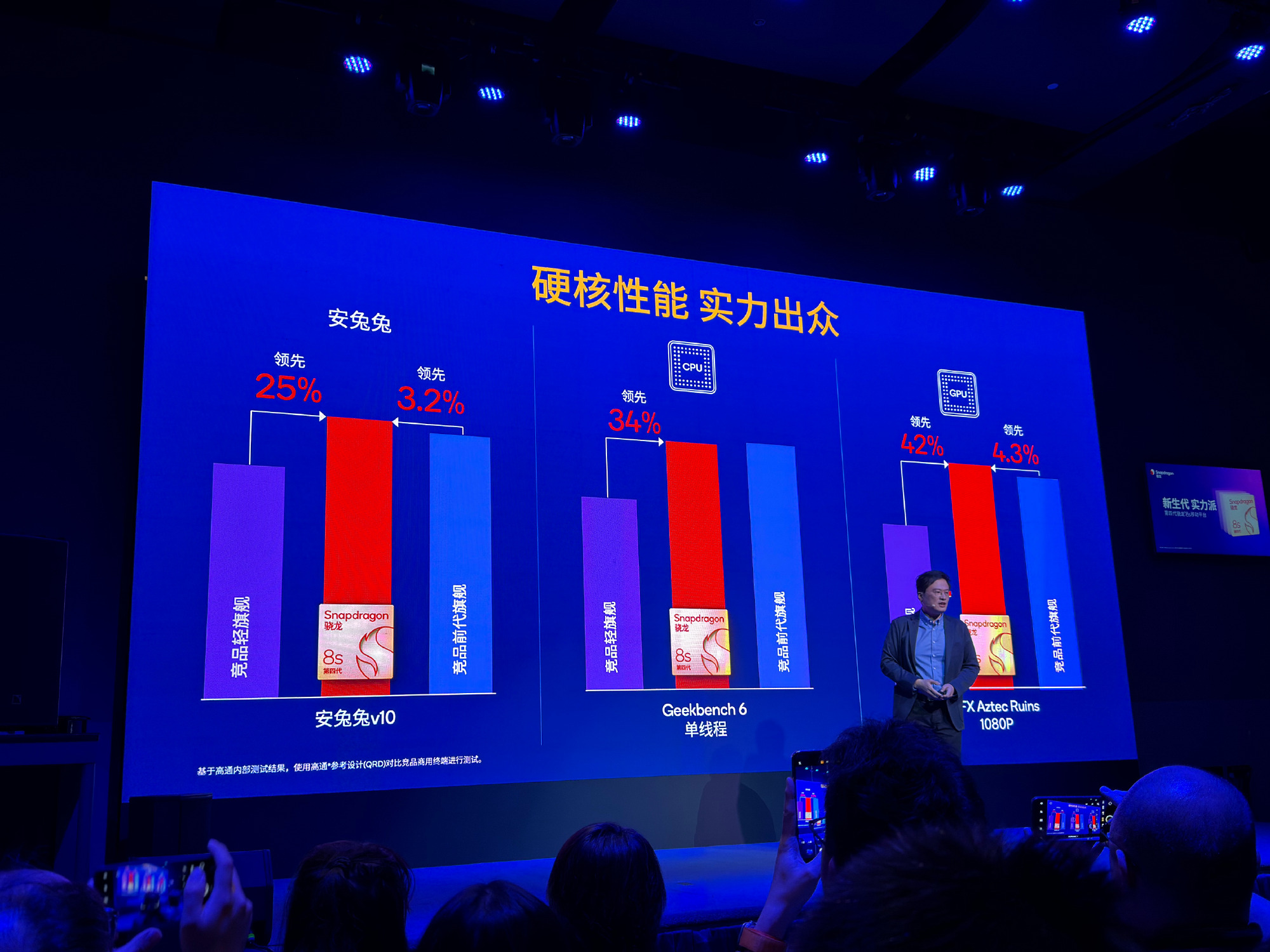 四、市场定位:性价比与体验的黄金平衡点骁龙 8s Gen4 通过 ARM 公版架构控制成本,在保持与骁龙 8 Gen3 相近性能的同时,价格下探至 2500 元档位。其 “旗舰功能下放” 策略直接冲击天玑 9400+、Exynos 2400 等竞品市场,迫使同价位机型在散热、续航或影像上进一步升级。对于追求均衡体验的消费者,搭载该芯片的机型将在性能、续航与功能全面性之间提供最优解。