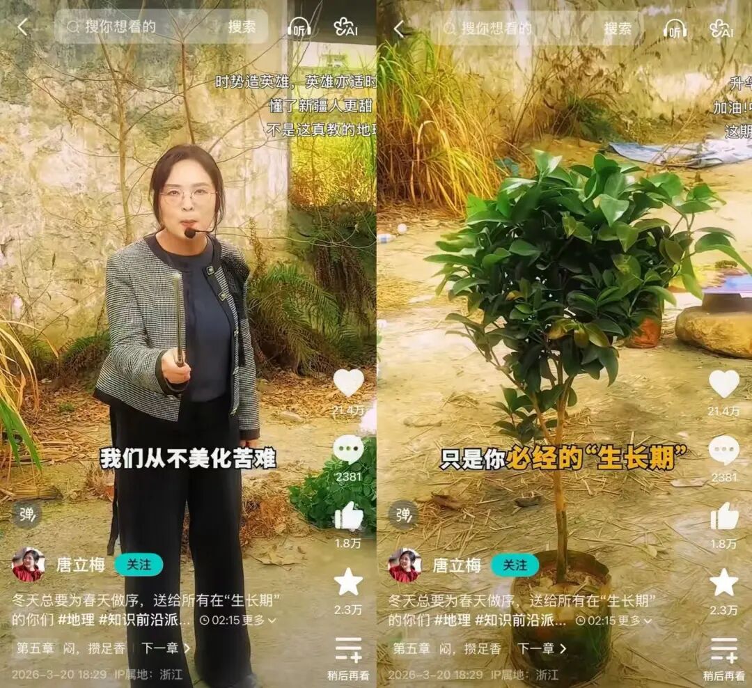 作为95后的@米三汉,会以《红楼梦》“反认他乡是故乡”的诗句提醒同龄人,很多时候精神痛苦是没找对自己的人生题目。历史创作者@张予不才,会带着当代视角去回看历史人物破大局的思路,为今天的人们启示生存处事的智慧。而女科学家@唐立梅,则会以地球生态中的现象与逻辑,巧妙引导年轻人理解困境与成长的关系,缓解过重的情绪压力。