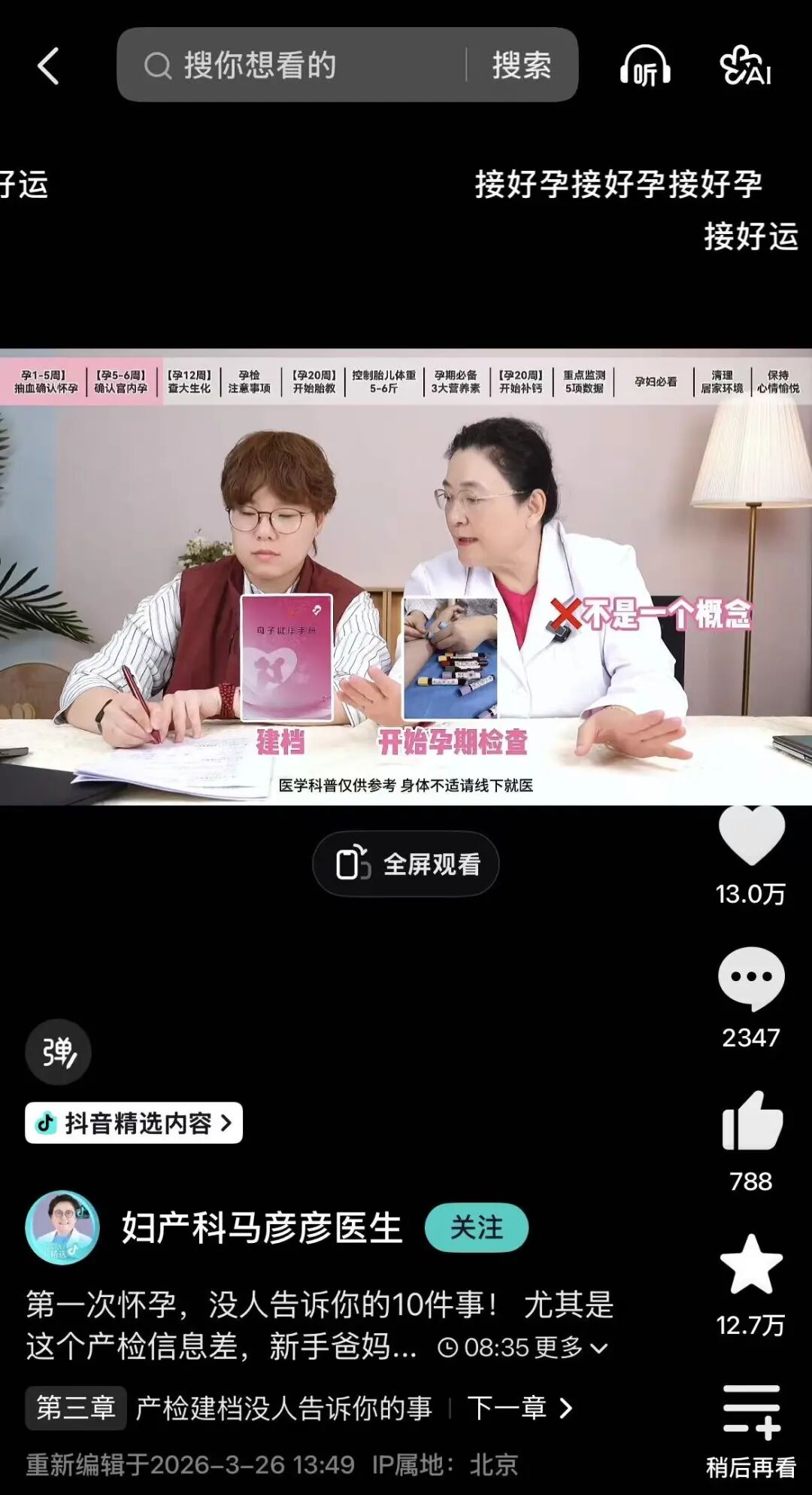 登上3月榜单的抖音精选作者@妇产科马彦彦医生,就是用温情、接地气的方式,去直击妇科产科的常见困惑。这一月她的新手妈妈系列视频,或是把孕期细化到每一周去提供产检指导,或是从“骨盆变化”“产后漏尿”“常见生育损伤”等令女性担忧的细微问题上贴心提醒。