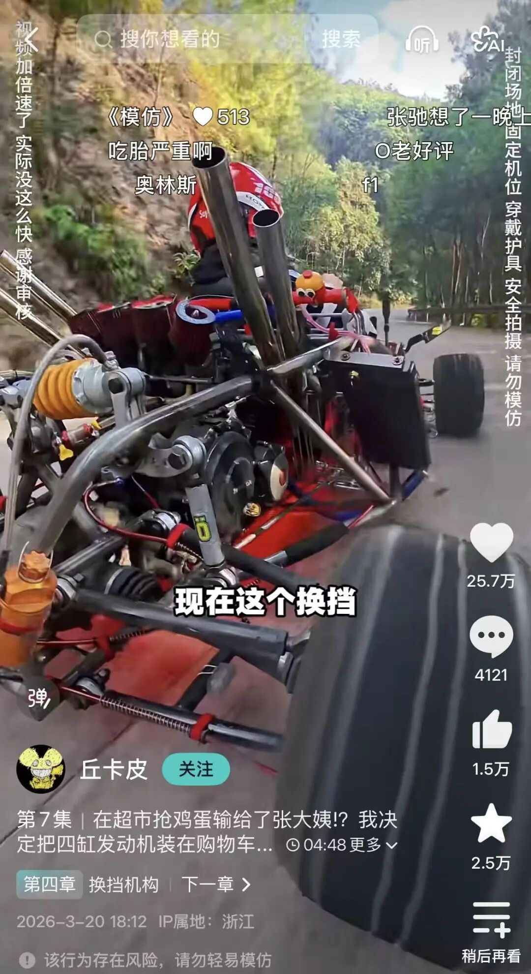 @LShang001 直接手搓火箭,一支支视频连续展现垂直起降、空中悬停、贴地悬停、横向移动等算法测试,共获5000w+播放量。@丘卡皮 把四缸发动机植入超市购物车,爆改出性能不俗、操控性强的卡丁车,上赛道实开后被用户惊呼“抖音居然都能看到造赛车了”。