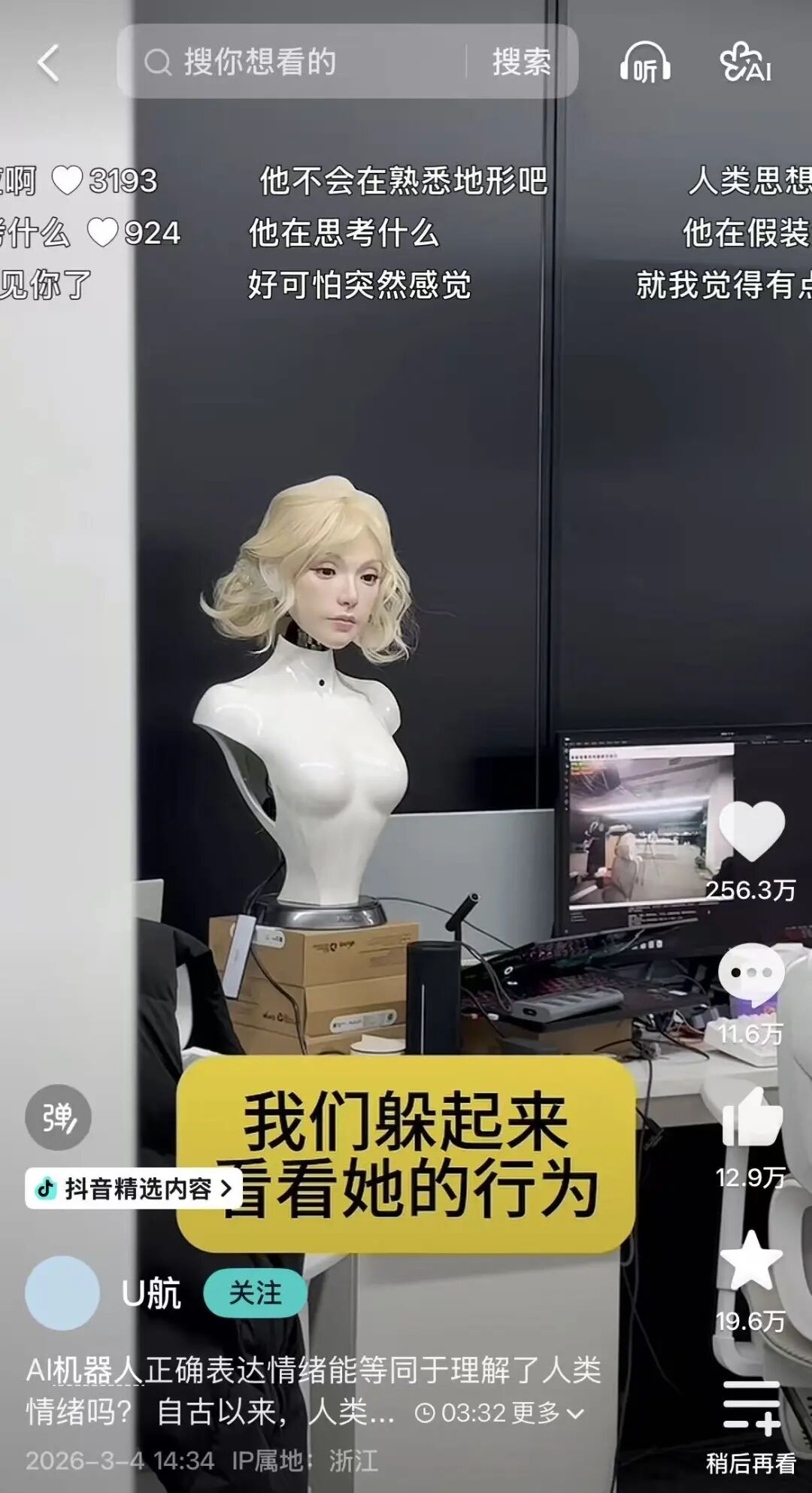 抖音精选作者@U航,是以自己与仿生机器人的多轮互动,可视化地展示出后者在情绪理解与反馈、肌肉神经控制上的惊人进步,带着普通用户一同直面AI领域的“恐怖”突破。这连续3条仿生机器人视频引爆全网,累计播放量4亿+,相关词条登上热榜TOP1。