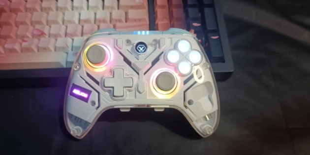 手柄更像是一件“能玩的数码潮玩”。机身提供白、粉、紫、黄四种配色,外壳采用高透设计,内部机甲结构、震动模组一览无余,再加上LOGO、摇杆环、ABXY按键与握柄上的RGB灯效同步闪动,赛博氛围比较浓。面壳是磁吸式结构,支持快速拆换与DIY装饰,想要个性化外观基本不用折腾太多。握在手里重量和稳定感都不错,霍尔摇杆与霍尔线性扳机带来的精准度明显比普通电位器更稳,特别是在赛车、射击类游戏里,细节控制和微操会更自信;只是无线模式125Hz回报率在极端竞技场景下略逊于有线,适合休闲与主流玩家,硬核极限党会更偏向有线。