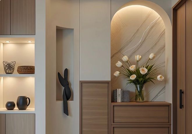 多功能壁龛嵌在墙体里,不会占用任何地面空间,小户型的玄关很适合。