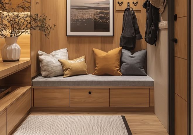 可以在进门靠墙处设计一个带收纳功能的卡座,不仅可以方便换鞋,而且卡座下方有大抽屉,用来放鞋,上方是软垫,墙面还可以安装挂衣钩。