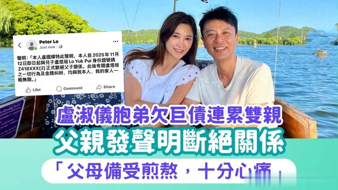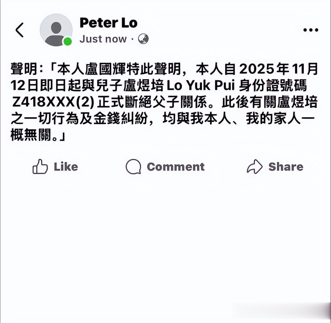 “本人卢国辉特此声明,本人自2025年11月12日即日起与儿子卢煜培LoYukPui,身份证号码Z418XXX(2)正式断绝父子关系,此后有关卢煜培之一切行为及金钱纠纷均与我本人,我的家人一概无关!”