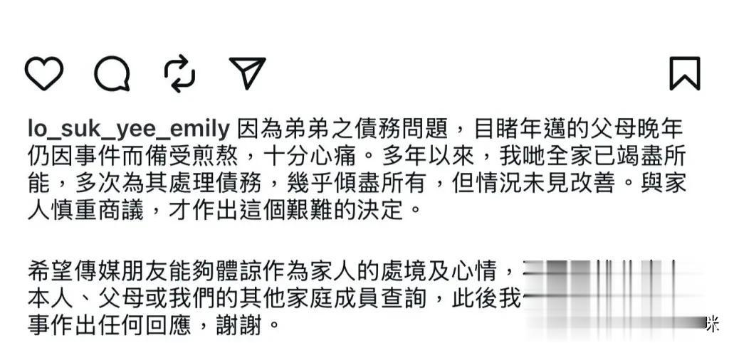 “希望传媒朋友能够体谅作为家人的处境及心情,不要再就此时向本人、父母或我们的其他家庭成员查询,此后我们亦不会再为此事作出任何回应”