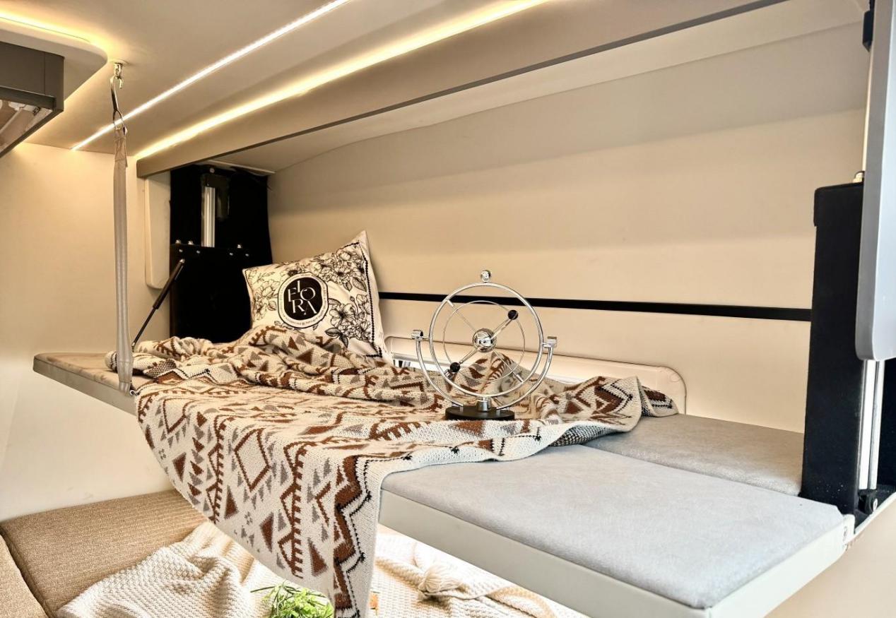 首先是床位设计。它并没有采用传统房车固定的床铺布局,而是设计了可升降的双人床和可拓展的尾部双人床。 想象一下,白天,你将顶部的床收起,空间瞬间变大,可以轻松地进行各种活动。到了晚上,只需轻轻一拉,一张宽大的1.45米2米的双人床就呈现在你眼前,让你在旅途中也能享受舒适的睡眠。更绝妙的是,后方固定床也可根据需要拓展成双人床,并且拓展后,旁边完全不影响卫浴间的进出,为夜间起夜提供了极大的便利性! 这设计,是不是绝了?除了床位,铁C还配备了车内车外双厨房!这对于热爱烹饪的房车爱好者来说,绝对是福音! 你想想,无论是在风景如画的野外,还是在热闹非凡的城市郊外,你都可以随时随地享受自己烹饪的美食。而且,车内厨房的配置相当齐全,从操作台到电磁炉,再到抽油烟机,一应俱全,让你在车内也能轻松完成各种复杂的烹饪操作。 车外厨房在露营场景中,更是极大的便利。