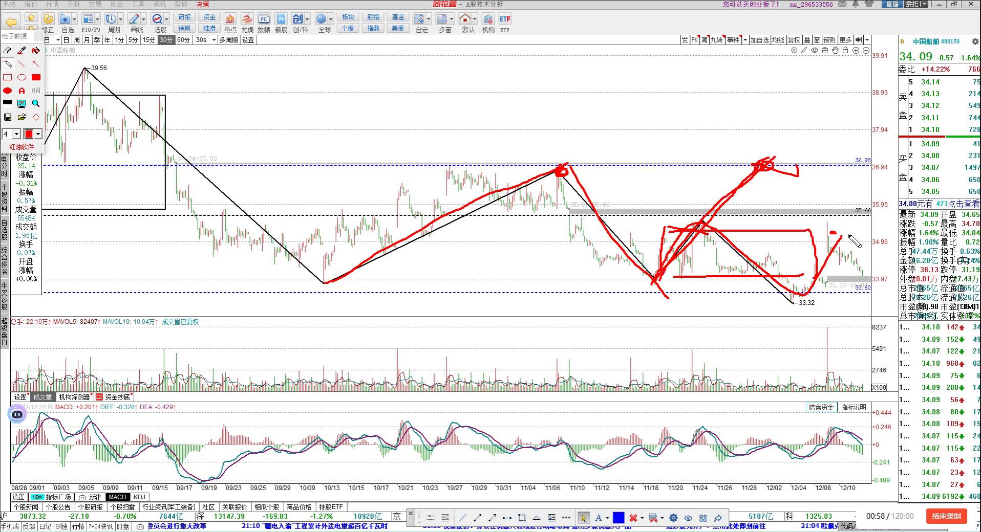 如果不破三十三点三二这个位置,在这里产生底分型直接向上突破三十五点六六才能确认这一笔向上的空间打开,如果过不了三十五点六六仍然只能把当成下跌中速的震荡。