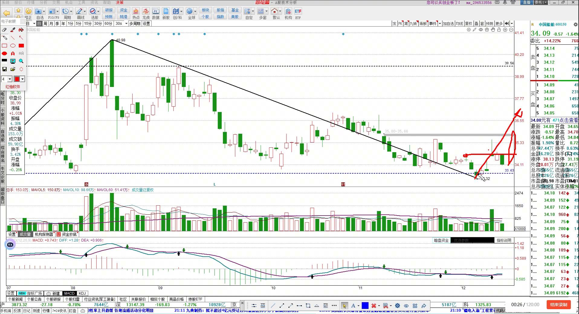 说一下中国传播,中国传播之前跟大家说这里回调的目标点位是三点六,这个位置目前来说已经到了,但是中线结构上看还没有底分型的出现,在日线结构上面已经到达了上沿的位置三十三点六,到三十三点六的位置也就意味着这个位置是有可能会产生三百的。