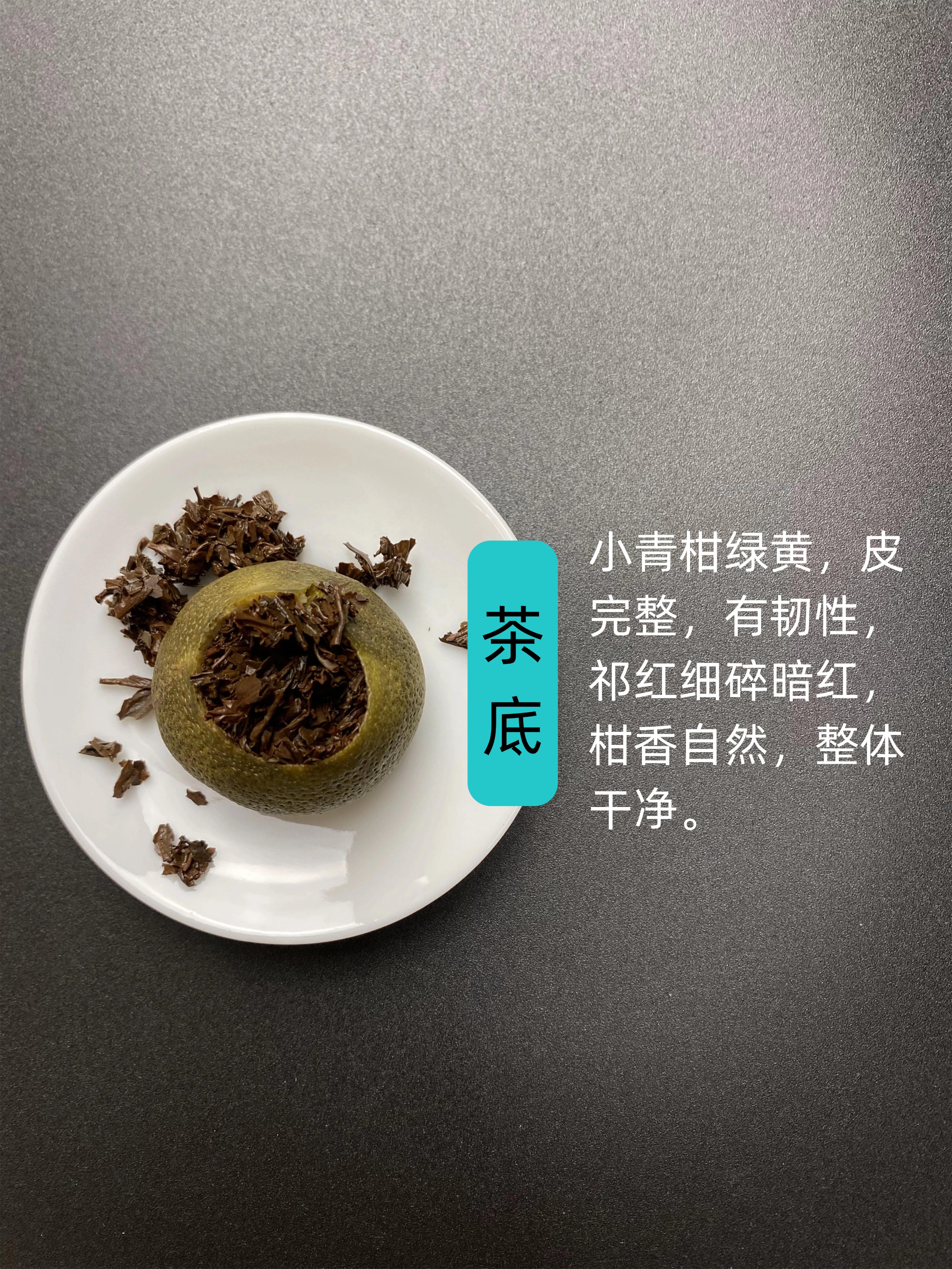 茶底,小青柑绿黄,皮完整,有韧性,祁红细碎暗红,柑香自然,整体干净。