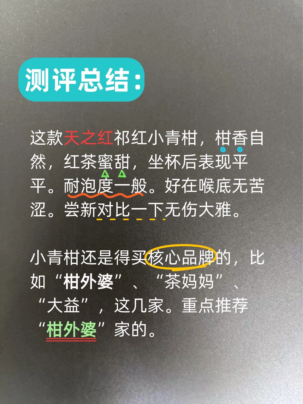 小青柑还是得买核心品牌的,比如“柑外婆”、“茶妈妈”、“大益”,这几家。重点推荐“柑外婆”家的。